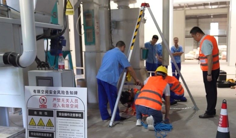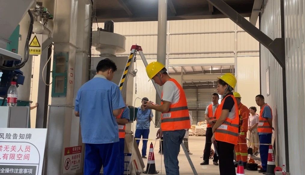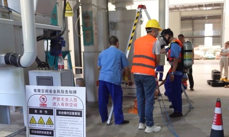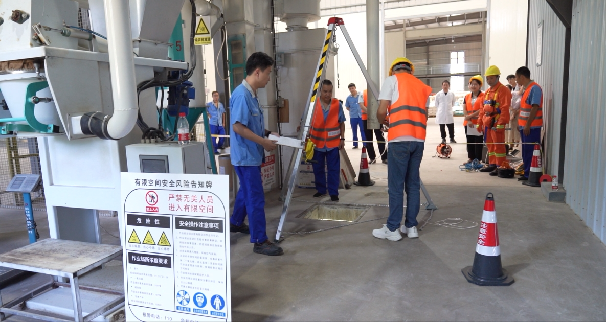 本次演練的有限空間位于混合型飼料添加劑生產(chǎn)車間的地下,現(xiàn)場作業(yè)組、檢測組、救援組、監(jiān)護組等參演人員,攜各類作業(yè)設備裝備按規(guī)范流程開展準備工作。